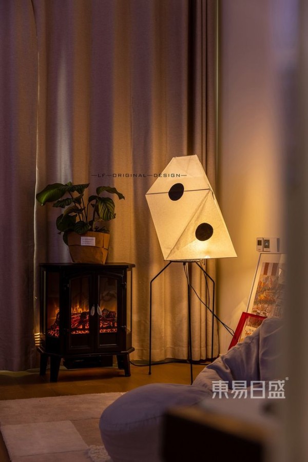 壁炉的装饰品,柔软的懒人沙发坐垫,在泛黄的灯光烘托下,更有氛围感,极大的提高了家居生活幸福感。