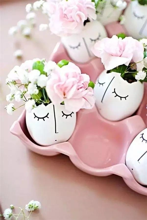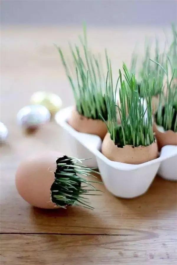打鸡蛋后留下的蛋壳收集起来,在蛋壳里装上土,撒种,浇水,过不了几天就可以长出植物的小苗来。