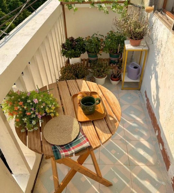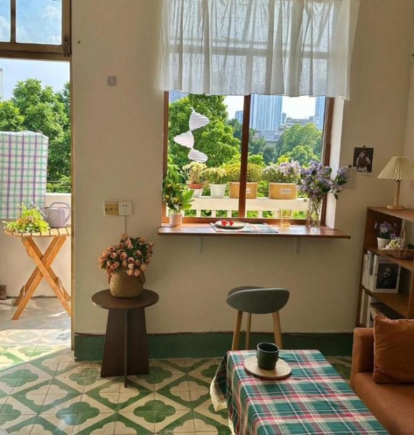 打扫干净之后,刷漆把发黑的部分掩盖住。然后买了一张休闲的折叠小圆桌,角落摆放一些绿植盆栽和花架。