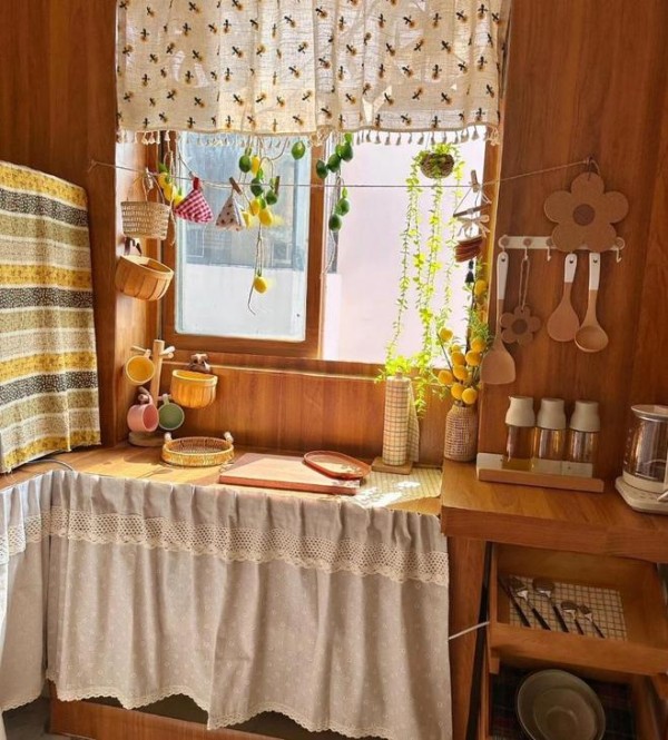 为了遮丑,排风扇的墙面也遮挡了小窗帘,就连消毒柜也被罩起来。不得不说,一番“遮丑”之后,呈现出来的效果还是蛮好看的。