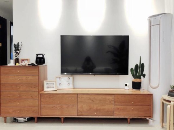 屋里保留了地砖和吊顶,但是额外加了6个小射灯,看起来更加温馨,家具选的都是木质家具,颇有质感。