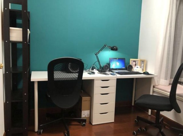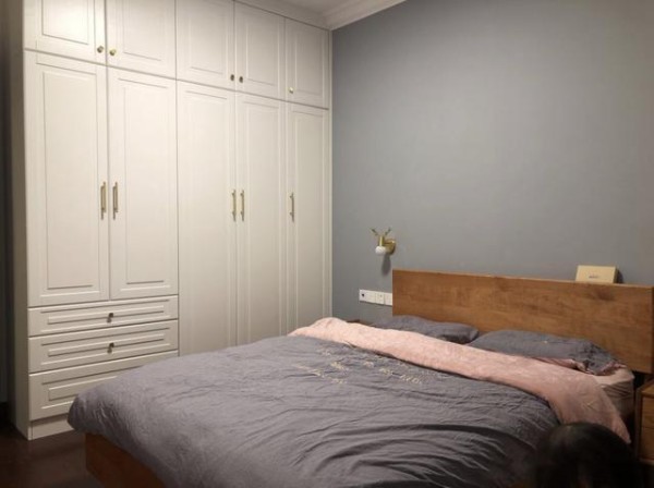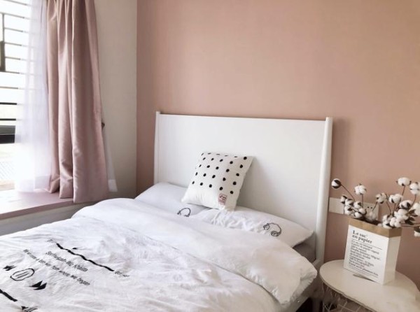 三个卧室,其中一个被当做书房,卧室分别是大白墙加一面彩色墙,选的是都芳的三种涂料。主人房高级灰,宝宝房干枯玫瑰粉,书房复古绿。