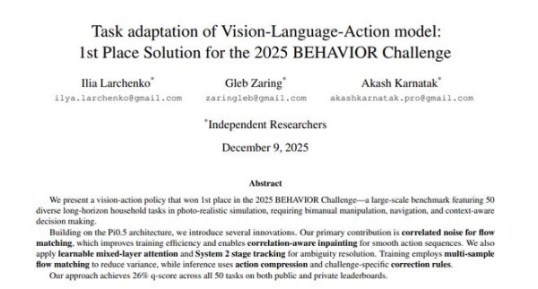 这项由独立研究员伊利亚·拉尔琴科、格列布·扎林和阿卡什·卡纳塔克组成的团队完成的突破性研究,在2025年12月9日发表的论文中详细介绍了他们如何在BEHAVIOR挑战赛中夺得冠军。该论文题为《Vision-Language-Action模型的任务适应:2025年BEHAVIOR挑战赛第一名解决方案》,有兴趣深入了解的读者可以通过arXiv:2512.06951v1查询完整论文。