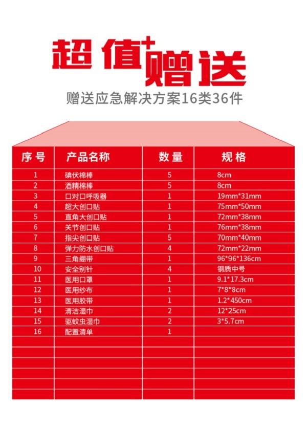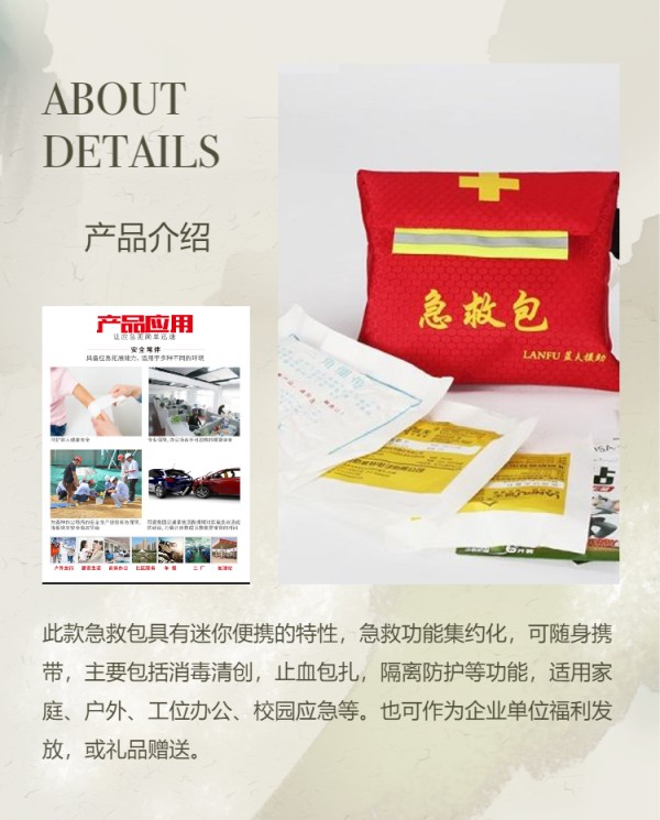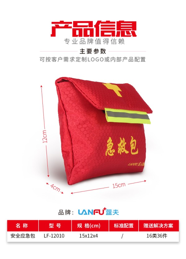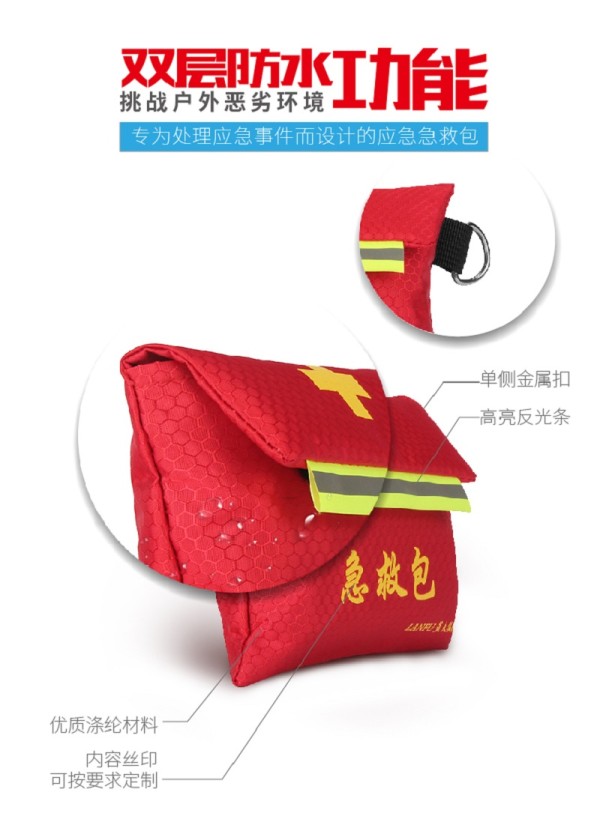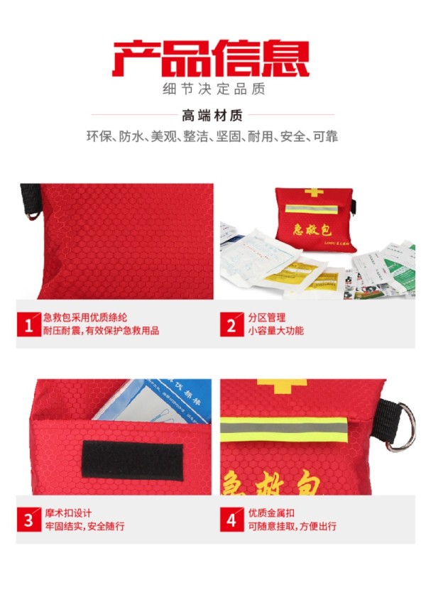 产品参数 型号LF-12010 长度15cm 宽度4cm 高度12cm 材质涤纶 颜色红色 是否进口否 加工定制是 可售卖地全国 等级一级 携带方式手提 品牌蓝夫 用途便携急救包 规格15*12*4cm 适用场景户外运动、野外作业随身携带,家庭及办公环境应急急救 用途范围户外家用学校等 类型安全急救包 优势耐磨、耐刮、防泼水 产品特性环保防水涂层,结实耐用
