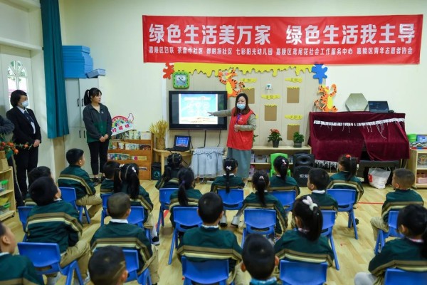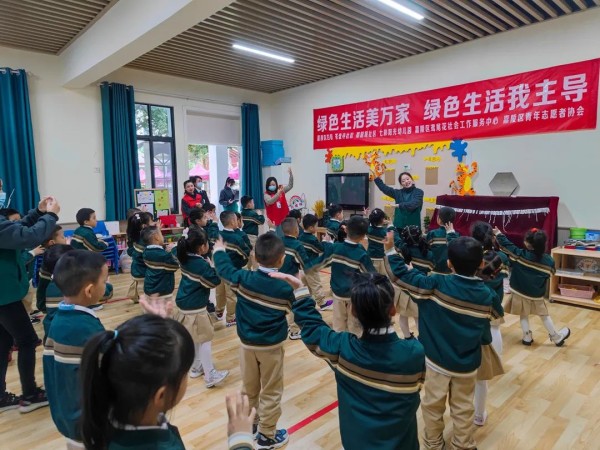 活动中,老师们和鸢尾花社会工作服务中心的社工,围绕“绿色生活我主导”主题,通过播放展示视频图片、分享日常衣、食、住、行的绿色低碳生活、做环保游戏和教授环保歌舞等方式,让孩子们了解了常见的地球灾难及其产生的简单原因,知道了地球和谐的生态环境对人类和动植物生存的重要性,从而引导孩子们从小树立环境保护意识,践行低碳绿色生活方式,同时把环保节能理念传递给更多的人。