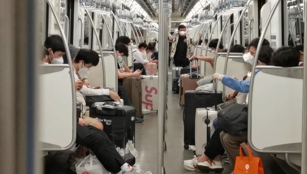 车厢里几乎“座无虚席”,乘客们也都自觉戴好口罩,彼此互不攀谈。还有人穿着隔离衣、防护服上车。中途停靠其他站点,陆续有拉着行李箱进站的乘客。