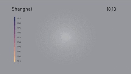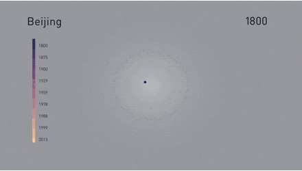 另一个问题是城市扩张。这是过去200年上海跟北京的城市面积,刚开始几乎没有什么变化,看上去就像是静止的。但突然在过去20年,“轰”地一下它就爆炸出去了,因为小汽车开始进入家庭。