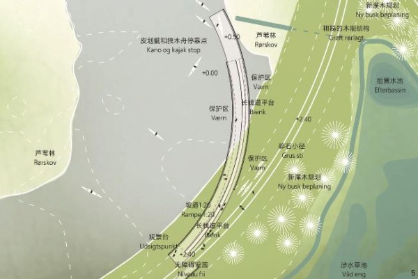 观景平台兼具向游客普及本地栖息地价值、雨水处理以及自然与城市环境融合的知识的功能。通过鹳草甸复合开发策略,项目将城市河流对岸的草地改造成湿地草甸。这一策略将气候保护与城市、自然协同发展相结合,体现了C.F. 莫勒建筑事务所的整体性设计理念。