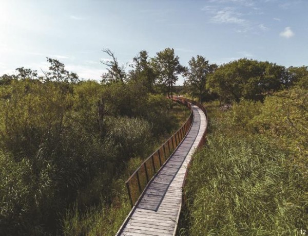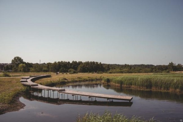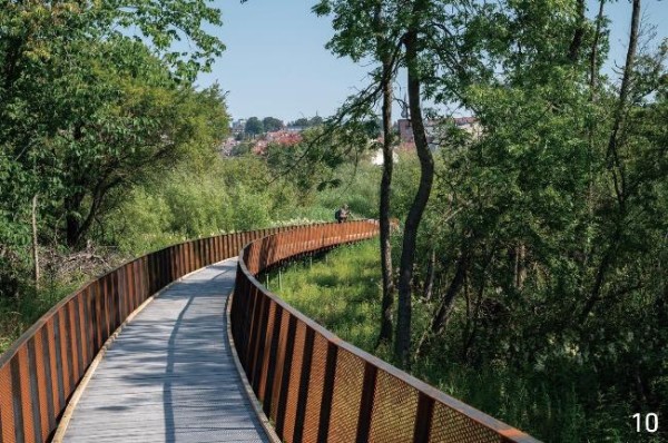 游客造访鹳草甸时,会经过放牧的牛群,再抵达位于湿地草甸中央的半月形观景平台。一条由表面带有凹槽的落叶松木板搭建的高架栈道,从堤坝蜿蜒,穿过湿地草甸,抵达古德纳河岸供划独木舟的人们登船的码头。这一设计既实现了防洪功能,又提供了休闲娱乐的机会,完美融合了城市与自然景观。