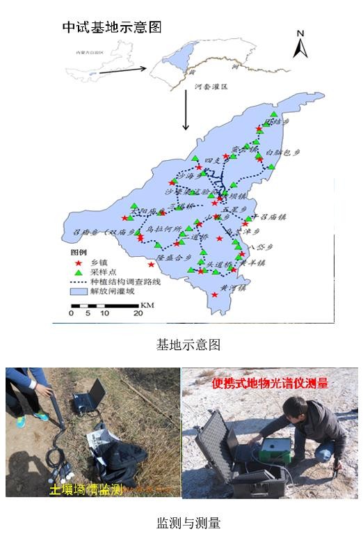 4、高效节水灌溉技术应用中试基地,2008年在内蒙古河套灌区解放闸灌域建成,重点开展灌溉制度优化、区域作物缺水诊断、农业水资源优化配置和水盐调控管理等方面的试验研究与应用,涉及农田水循环过程中降雨、灌溉、耗水、排水、渗漏等各个环节,形成从农渠尺度、支渠尺度到灌域尺度的多水平衡要素观测系统,基地内布设几十个重点监测点,配备有激光粒度仪、LI-7500、土壤水/盐/温测量仪、土壤pH-电导勘测系统、地物光谱仪、梯形堰、多普勒超声波明渠流量计等设备,同时有定期的养分、盐分取样分析等。