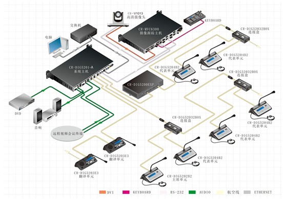 以简单的网络系统处理和传送数字信号成为目前世界上最为先进的会议系统。数字化的会议系统,在同一根电缆上实现多路同时发言,多路同时投票、表决等功能。它对于所有类型的会议都提供灵活的管理,具有多功能、高音质、数据传送保密等优点,可以对会议的全过程实行全面的控制智能型会议系统由会议系统主机、会议主席发言单元、会议代表发言单元、会议管理软件等组成。同时还有专业跟踪摄像机,能够自动实时跟踪讲话坐席。见下图-系统连接图