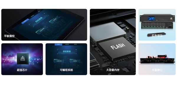 通过中控主机上的RS232接口控制LED拼接、高清音视频混合矩阵,实现矩阵的功能控制及所有音视频、信号的自由切换;