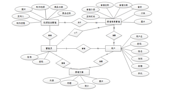 通过对菜谱推荐系统的主要功能信息进行规划并分为若干功能实体信息,实体信息将使用E-R图加以表示,本系统的几个主要功能实体图如图4-2所示。