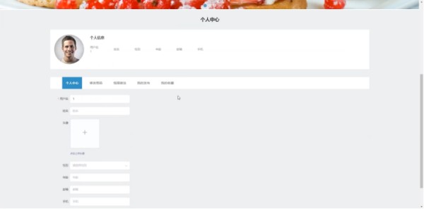 个人中心:在个人中心页面可以对个人中心、修改密码、视频做法、我的发布、我的收藏进行详细操作;个人中心页面如图5-5所示:
