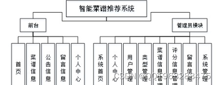 通过调研和分析,该系统的功能设计为登录注册、个人信息修改、对用户管理、类型管理、菜谱信息管理、评分信息管理、留言信息、系统管理等功能进行管理。