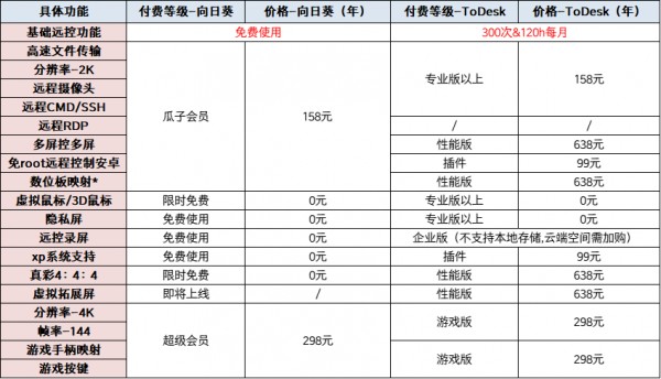 如果我们需要开通远控会员实现高性能远控,向日葵的价格设置也是这几家里相对便宜合理的。具体可以看网友此前整理的这张图: