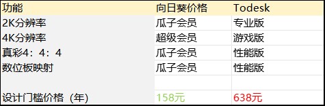 直观一些的话,我们就以远程设计这一场景为例:远控分辨率、4:4:4真彩模式、数位板映射这几个设计场景的核心功能,向日葵的瓜子会员即可体验(4K分辨率需要超级会员),但Todesk则将其直接归入最贵的“性能版”档位,价格天差地别。