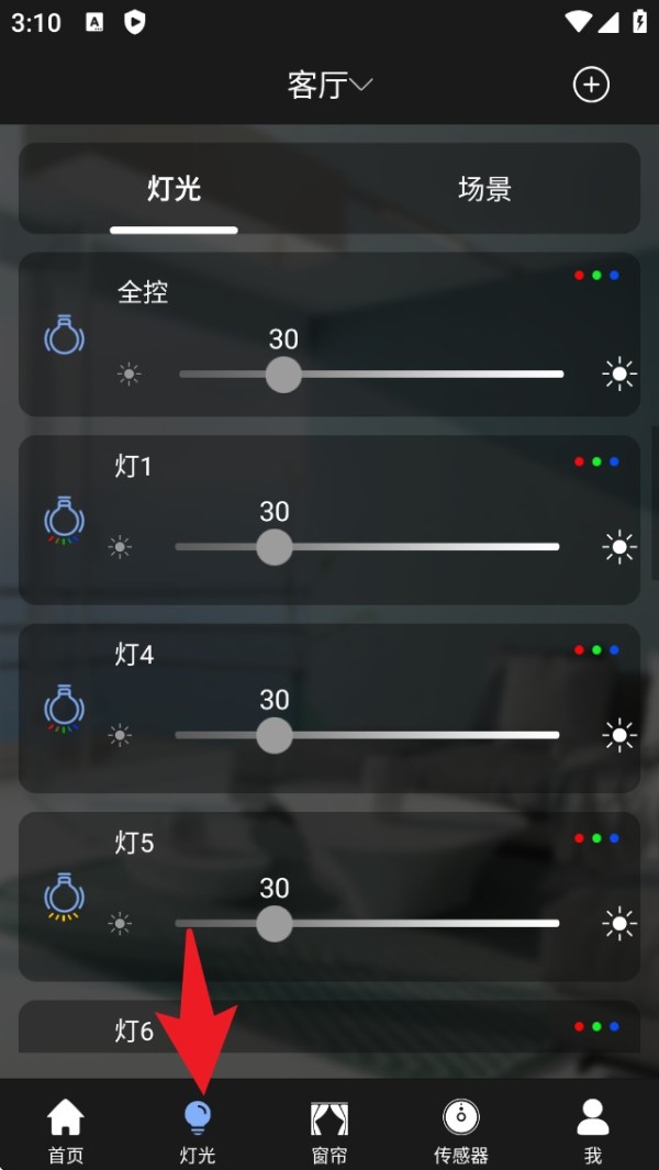 2. 在“灯光”控制页面,您可以通过滑动调节不同灯光的亮度,或者控制所有灯光的亮度,满足您的需求。