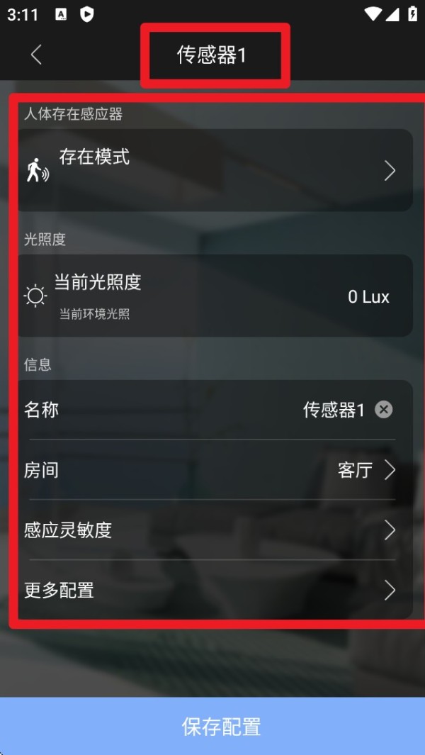 5. 在传感器设置页面,您可以修改传感器名称、房间信息及灵敏度设置,完成后保存配置。