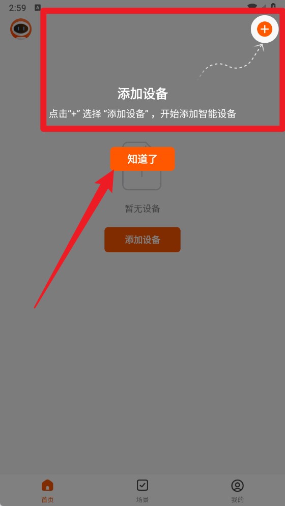 3、在首页点击【+】按钮,选择添加设备,即可开始绑定智能设备。
