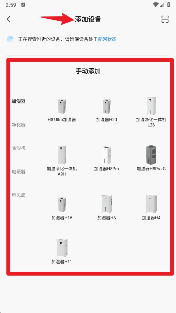 4、在添加设备界面,可以根据设备类型选择需要绑定的加湿器、净化器、除湿机等型号,完成配网操作。