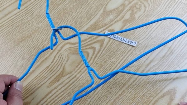 6.现在我们拿两个衣架过来,把衣架头穿过拉环的小孔里面,下面的这个小孔穿过另外一个衣架,这样衣架就组合好了,如果家里要收纳的衣服比较多,我们可以多准备一些拉环。