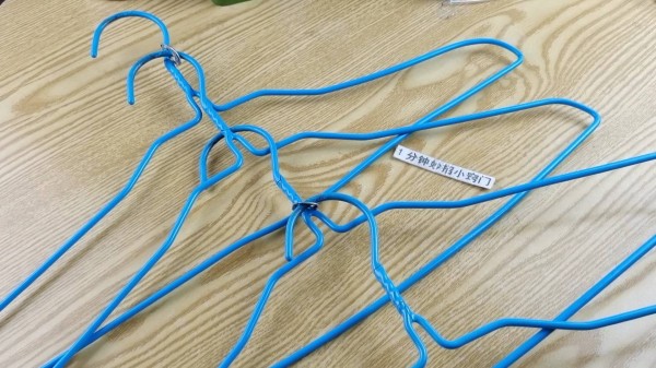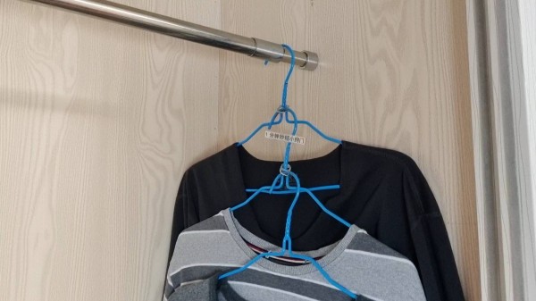 7.现在我们把衣架挂在另外一个衣架的上面,用来收纳衣服,这样一个衣架的位置,就可以挂四件衣服了,如果想要多挂几件衣服,再用上几个拉环就可以了。
