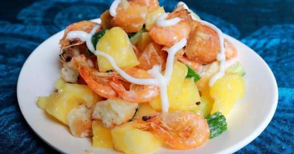 5)将菠萝块、虾仁、西红柿丁、黄瓜丁混合后,淋上酸奶汁,最后再放入冰箱冷藏10分钟即可食用。