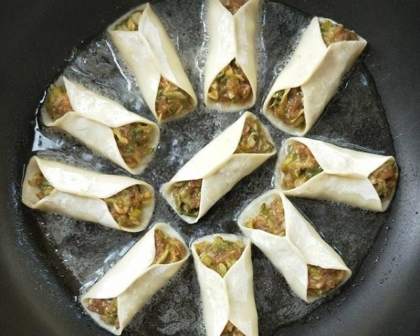 7、再把制作好的牛肉馅料包入擀好的面皮里,制作成锅贴,然后热锅烧油,放入锅贴,用小火煎炸,等到把锅贴三面都煎炸到变为金黄色,即可;