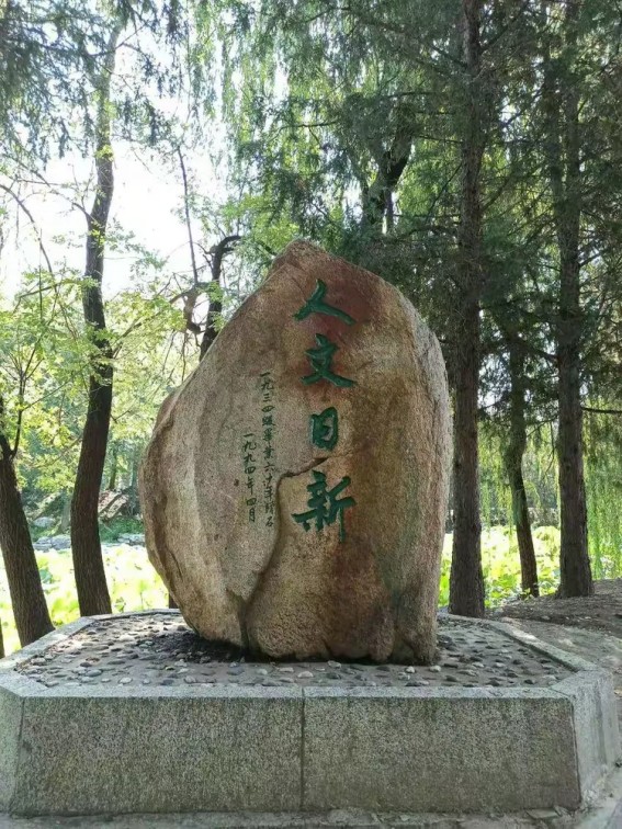 “人文日新”碑,由清华1934级校友于毕业60周年之际(1994年)敬赠母校,并于校庆83周年纪念日隆重落成。碑上镌刻的“人文日新”四字,正是清华校园文化与精神的核心象征。