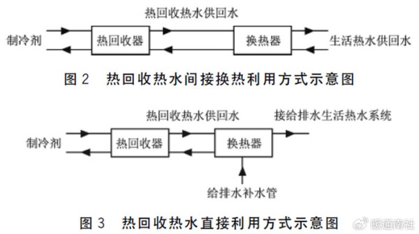 该方式由于间接换热,热量利用率不高,但是对热回收系统卫生要求低,可以保证生活热水水质不受影响。另外也可以通过将热回收热水系统直接接入生活热水系统,对该热回收热水进行直接利用。该方式无换热损失,热量利用率高,但是对热回收热水系统卫生标准要求高,需满足生活热水卫生要求。