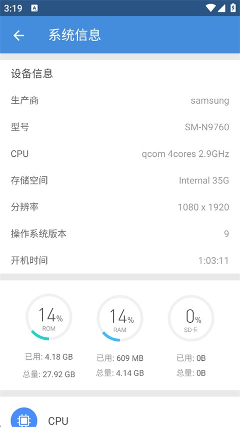 ●实时手机状况展示(RAM信息,ROM信息,SD卡存储信息以及 CPU信息)