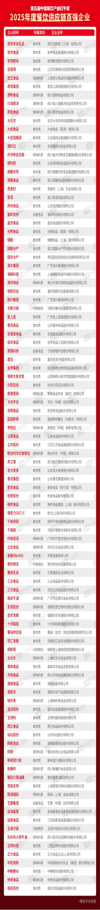 “2025年度餐饮供应链百强企业”涵盖食材类、调味料类、冷链物流类、设备用品类、其他类五大核心领域。
