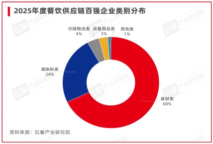 从“2025年度餐饮供应链百强企业”榜单的企业类别分布来看,食材类企业依旧占据主导地位,占比达到68%,较去年有所上升,充分彰显了食材在餐饮行业根基性的重要地位;调味料类企业紧随其后,占比为24%,展现出该赛道的强劲发展势头;设备用品和冷链物流企业占比相对稳定,分别为3%和4%;此外,还有其他类的占比为1%。