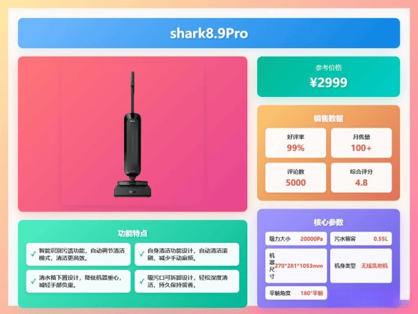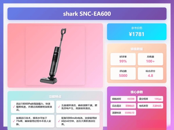 具体到型号选择上,Shark鲨客的E5S1、7.9、E3、8.9Pro、SNC-EA600等型号各有侧重,有的主打轻薄平躺,有的强调大吸力和多贴边清洁,还有的则注重除菌功能。追觅的G10Mix、T40Ultra、T50、T50 Ultra、G20pro等型号则在智能感应、多功能集成和高温除菌等方面表现突出。