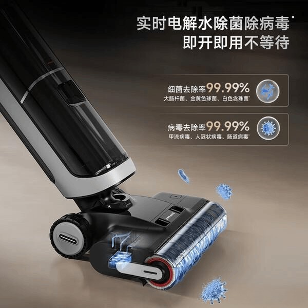 它具备三重深度清洁模式,包括泡洗、滚洗和透洗,深层溶解污垢,全面除菌,并配合电解水除菌技术,安全环保,还能有效杀灭细菌。热风自烘干功能让清洁后拖布飞快干燥,没有异味,让使用体验更安心。“洗完地面不潮湿,地面干得快,不用担心细菌滋生。”