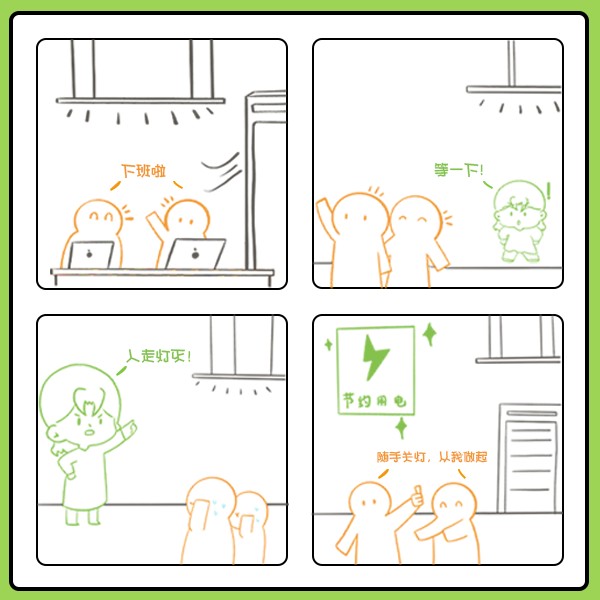 2.在公司可以互相提醒,看到同事离开区域/工位灯还亮着,友善提醒一句:“嘿,灯忘关啦~” 一起养成好习惯。