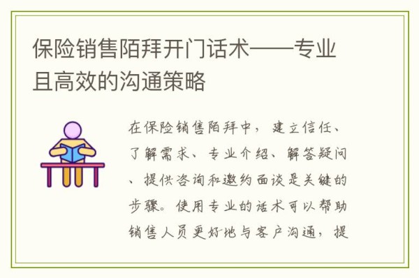 在保险销售领域,陌拜作为一种有效的市场开拓方式,其成功与否很大程度上取决于销售人员所使用的话术。下面将介绍一些专业的保险销售陌拜开门话术,帮助销售人员更好地与客户建立联系并促成交易。