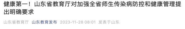 11月27日,山东省教育厅印发通知,倡导广大师生牢固树立“健康第一”的教育理念,有效应对当前我省多种传染病叠加流行风险,最大限度保障师生安全健康。