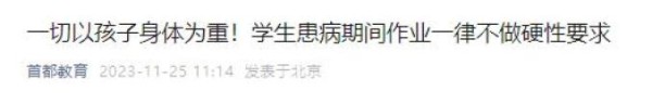 11月25日,“首都教育”微信公众号发文,强调一切应以孩子身体为重,学生患病期间作业一律不做硬性要求。