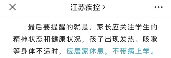 11月28日,“江苏疾控”微信公众号发布健康提示:家长应关注学生的精神状态和健康状况,孩子出现发热、咳嗽等身体不适时,应居家休息,不带病上学。孩子出现呼吸道症状后,注意观察病情变化,如果孩子出现持续发热、剧烈咳嗽、病情反复,要及时就医;家人照顾患者、陪同就医时,也要戴好口罩,做好自我防护。