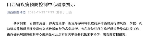 11月23日,“山西疾控动态”微信公众号发布健康提示:为积极做好秋冬季呼吸道传染病防控工作,山西省疾病预防控制中心健康提示公众和相关单位要积极采取科学、规范的防控措施。