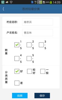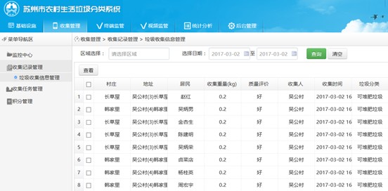收集人员在收集居民垃圾时,通过手持端设备扫描标签确认居民身份,现场估算垃圾量,评价分类质量,形成收集信息,信息自动上传系统平台,系统生成分类收集记录,包括收集点编码,所属村,所属居民,垃圾类型,重量,分类质量,收集人员,收集时间等信息。