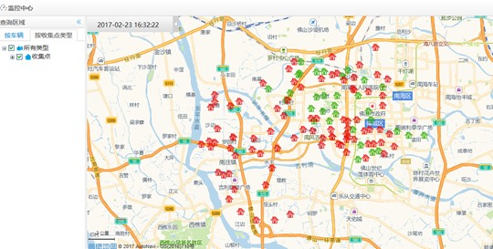 以表格、GIS等形式实时、直观的展示所有分类收集点的收集状态,在地图中以不同颜色标识不同垃圾收集状态,如红色待收,绿色已收,并进行汇总统计,可查看区域内收集率。