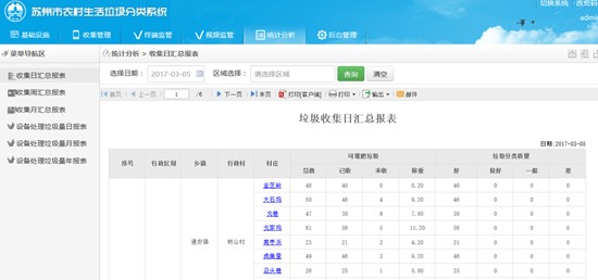 区域日收集汇总报表:以区域(如村)为数据单元,实现每个区域收集情况的展示,如此区域应收集100个垃圾桶,实际收集多少个、未收集多少个。
