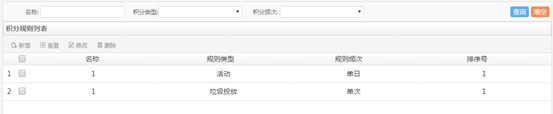 管理人员根据实际情况在系统配置投放积分规则。积分规则包括垃圾类型、积分来源(活动、投放等)、积分类型(按次积分、按量积分等)。
