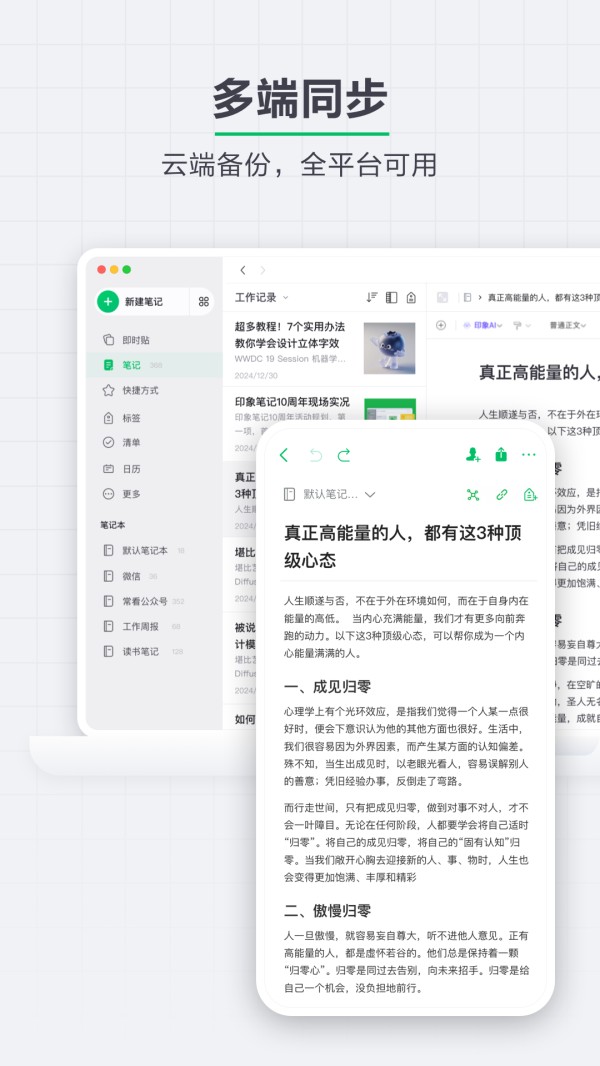 印象笔记是全球闻名的效率软件和知识管理工具。作为你的第二大脑,印象笔记可以帮助你简化工作、学习与生活。你可以在手机、电脑、平板等多种设备,无缝同步每天的见闻、灵感与思考。