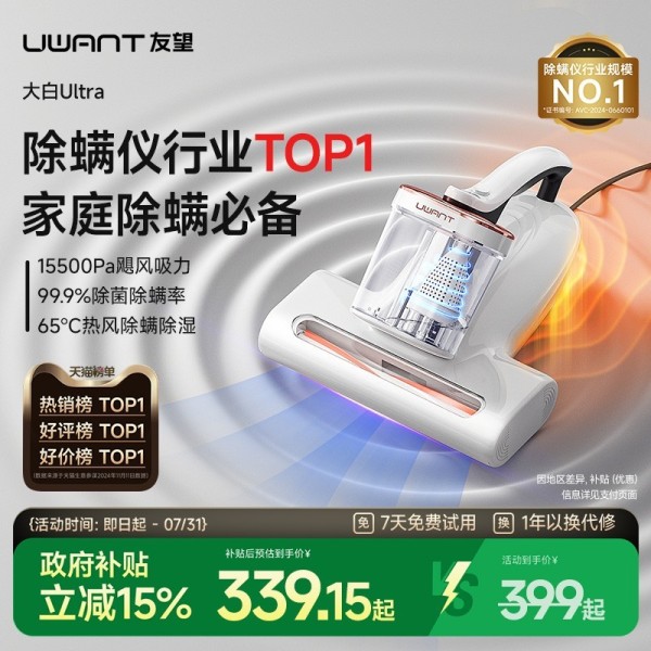 UWANT友望除螨仪小飓风M200s家用除螨神器强势促销中,原价1219元,现天猫特价仅需339.15元,还可叠加享受15%起减59.85元优惠活动,实付到手价超值划算,错过难遇!这款除螨仪集深层拍打、强力吸尘、UV紫外杀菌三重功效于一体,高效清除床褥、沙发、地毯等隐蔽角落的螨虫及过敏原,99.9%杀菌率守护家人呼吸健康,小巧机身却拥有强劲动力,操作简便,适合家庭日常清洁使用,是呵护肌肤敏感人群和有孩家庭的必备好物,现在入手正是最佳时机,速抢!