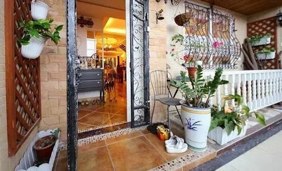 盛开的花朵盆栽,悬挂在古朴的装饰门两边,显得别出心裁。花园式的装扮,让狭长窄小的阳台焕然一新,这一刻只想暂时逃离都市,在这里享受内心的宁静。