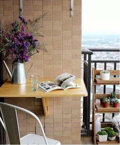 定做的阳台书桌可以靠墙收起,需要时打开,不占用空间,方便阅读需要,十分体贴。聪明的主人利用小阳台的方寸之地创造了一个自由的天地。